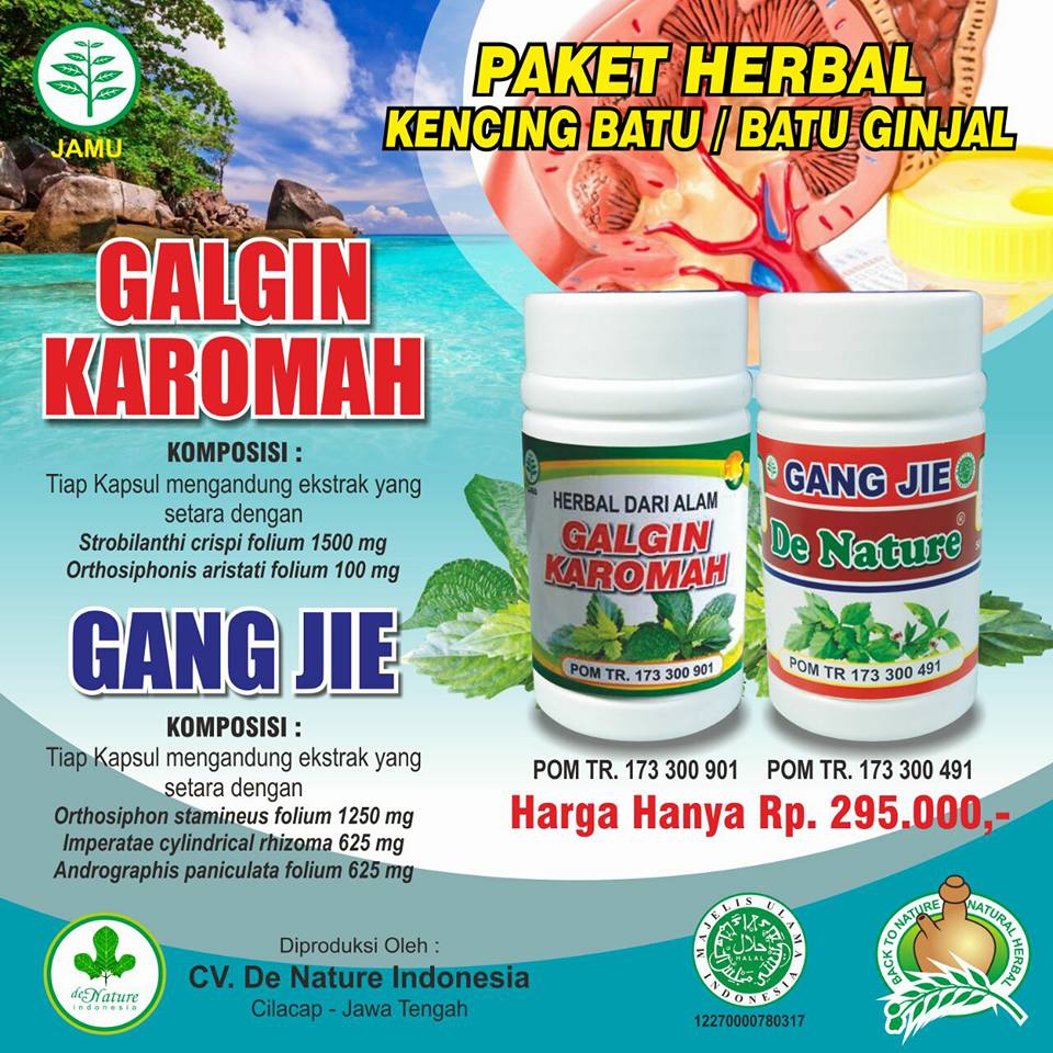 Galgin Karomah + Gang Jie dari kami De Nature. Salah satu produk Obat Herbal Alami, diproduksi lebih dari 10 tahun yang sudah dipercaya sampai sekarang. Terbuat dari bahan herbal, sehingga aman dikonsumsi tanpa menimbulkan efek Samping. Segera obati penyakit wasir anda, dengan izin Alloh SWT mudah-mudahan dapat terobati. Amin. Untuk pemesanan obat herbal Batu Ginjal bisa melakukan kontak dengan kami.